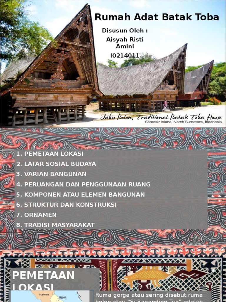 Adat budaya ini juga mereka wujudkan dalam pembangunan rumah adat. Rumah adat khas suku batak ini juga dibangun agar dapat diwariskan keoada generasi selanjutnya. Rumah adat batak toba berdasarkan fungsinya dapat dibedakan menjadi dua yaitu, rumah yang digunakan sebagai tempat tinggal (ruma) dan sebagai tempat penyimpanan (sopo). Berikut adalah makna lengkap dari rumah kamu yang dibuat suku batak tersebut. Kata pengantarpuji syukur penulis panjatkan kepada tuhan yang maha esa, bahwa penulis telah menyelesaikan tugas mata kuliah arsitektur nusantara yang membahas tentang salah satu rumah adat yang berada di indonesia.dalam penyusunan tugas ini, tidak sedikit hambatan yang penulis hadapi.